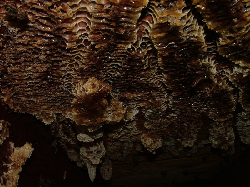 Below (15.25): Flash photo into cavity. Examination of this photo on a computer screen the same evening revealed a residual cluster of bees about a metre further into the cavity.