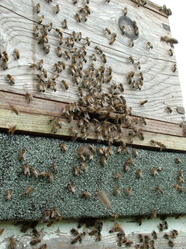 Below: Close-up of colony's entrance. A pollen carrying bee can be seen entering over a cable.