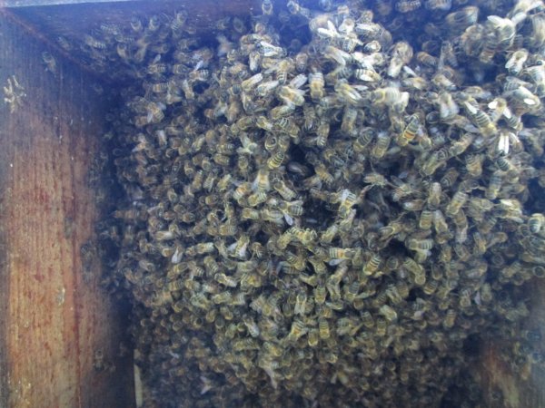 Below right: almost all bees have entered the cardboard box -- three palm-of-hand sized