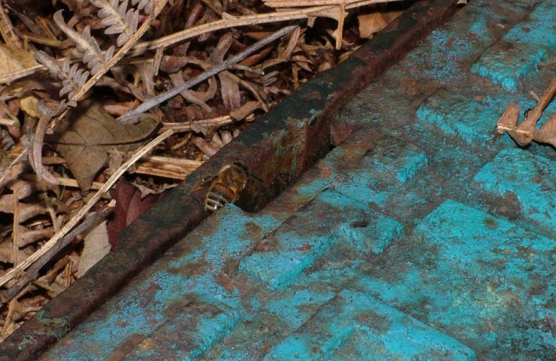 Below: the bees were entering through one of the crowbar holes in the cast iron cover.