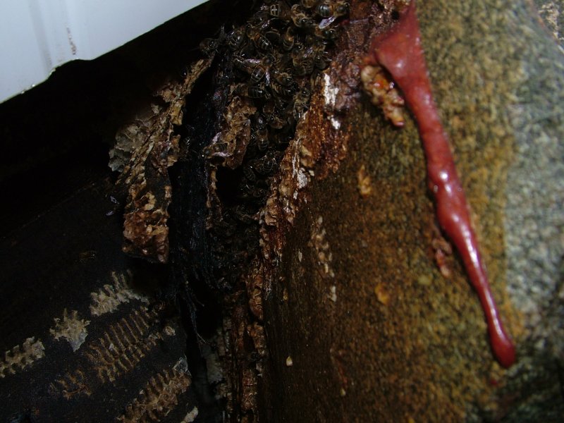 Residual honey was left to the robbers expected the following day (13 July). However, robbing and the intended work on the soffits, was partly hampered by rain showers. Robbers were still active in a sunny spell the day after that, when most of the work was completed. It was decided to leave the final sealing up of the cavity until the following day (14 July) to allow the honey to be removed by the robbers. Residual comb will eventually be destroyed by wax moths, whom a healthy colony keeps at bay, but who move in when the comb is no longer defended by the bees.