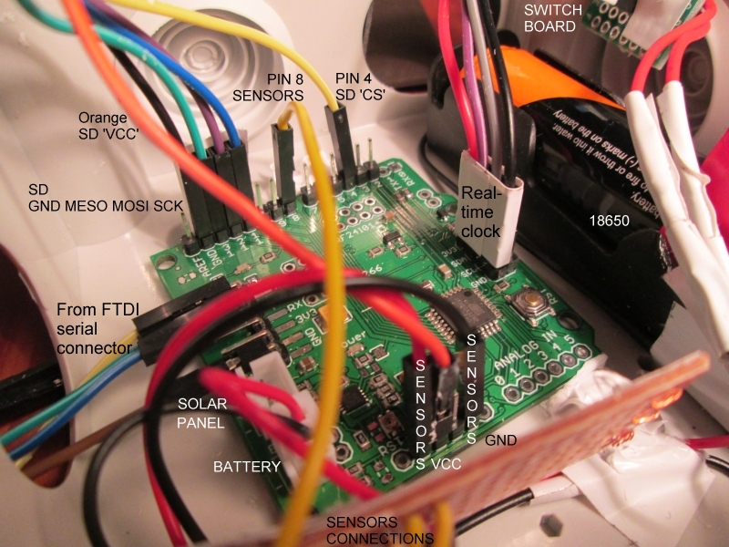 The monitor is based on a Ceech Astri Arista board with a real time clock, micro SD card writer/reader, a 18650 4.2V battery, and six DS18B20 waterproof temperature sensors. The Astri Arista emulates an Arduino Pro Mini (ATMega328, 3.3V, 8Mhz).