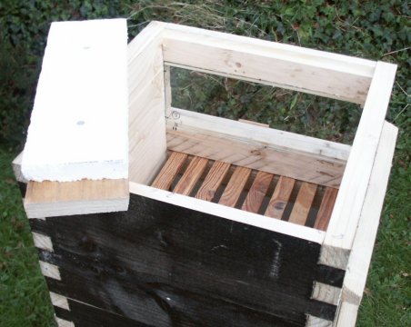 The inside view of the 'National' roof (above, left) shows all four vents. To make a vent, a hole is drilled from the outside, sloping upwards to prevent water seeping in, and emerges in the middle of the spacer battens which create a ventilated void space under the roof. The holes are closed on the inside with perforated zinc or other wasp/bee-proof material. This roof type has proved unproblematic with the Warré hive. No condensation forms under it. In the UK climate, it is customary to place a brick on the roof of each hive. With the Warré hive at exposed sites, particularly when four or more boxes are in place, two bricks are used.