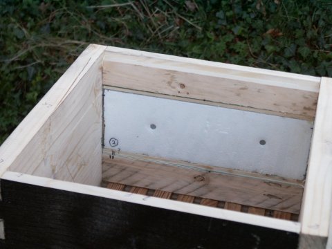 The quilt -- an insulating, but vapour permeable box -- is slightly modified in this version in that the insulating material is polystyrene pieces (used in packaging) instead of straw or dried leaves. It is covered top and bottom by thick cotton canvas (closely woven hessian is also suitable). As there are no vents in the quilt, heat loss is minimized, yet vapour and gases can find their way through the two layers of cloth and amongst the intervening fragments of polystyrene. A solid polystyrene sheet would not be suitable here as it would present a significant barrier to moisture and air diffusion. Hives I made later have a quilt to Warré specification: sackcloth fixed only underneath, fill of wood shavings (from an electric planer) and open at the top so the insulation can be turned over, and if necessary replaced.