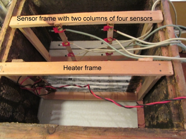 The method of Mitchell (2016) was applied to a two-box Warré hive. The hive was equipped with a top-bar cloth, quilt filled with planer shavings, Warré floor and roof. The boxes were made of 25 mm larch and both were fitted with top-bars. Frames were used for mounting the heater and sensors in the top box, substituting for two top-bars. As in Mitchell's study, the sensors were positioned at 8, 67, 124 and 181 mm below the top of the frame which in the present study had a top-bar 10 mm thick. The heater (12.5 watts) comprised four pairs of resistance wire coils wired in parallel (~5 ohms) and mounted in a frame so that the bottom of the heater was 195 mm from the top-bar cloth, thus 5 mm higher than in Mitchell's study.